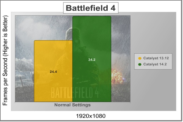 Catalyst_14-2_Drivers_BF4Battlefield 4 performance is increased by nearly 40% when updating to the Catalyst 14.2 Beta drivers. This makes the game easily playable at normal settings.