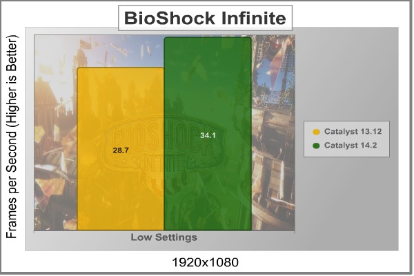 Catalyst_14-2_Drivers_BioshockBioshock only gains about 20% performance, but it still makes all the difference, putting it above the 30FPS threshold.