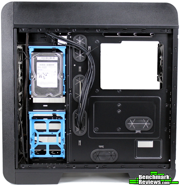 Although, there’s one feature we haven’t looked at yet. Not only are the drive cages modular, but there are two additional drive mounting points on the back of the case. Simply take two of the drive sleds out of their cages and hang/snap them on the included supports. I’m not sure if I’ve seen quite this approach before, but I like it. Especially for my builds, which are usually gaming oriented and rarely use more than two drives (SSD+HDD).