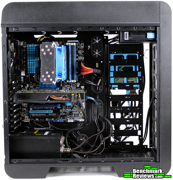 The above photo is looking down on the Core V71 from the top, where the extra 200mm fan mounting location and offset 120/140mm fan/rad mounting points are obvious. While it may ruin the symmetry (you don’t see it anyway), offset radiator and fan mounting points are essential for clearing motherboard components.