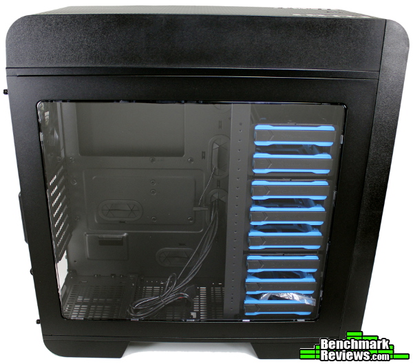The large side panel window provides a great view of your components. Both side panels are hinged, and attach with captive thumbscrews. That’s a nice touch, as the thumbscrews stay with the panel – no need to set them aside or keep track of them when swapping out drives or devices. Both side panels seem a bit on the thin side, but at least that helps keep the weight down. They’re sturdy enough, so at least you don’t have to battle the chassis to get the thumbscrews to line up when replacing the panel.