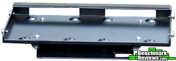 Taking a closer look at the front 2.5″ / ODD bay shows the mounting system for the drives. The slim optical drive slots into the bottom of the bay and is fixed in place by four screws on the bottom. To remove the bay cover on the front of the case simply push the cover from the outside into the case and it will pop right out. The 2.5″ drives are mounted facing into the case and secured with four screws in the bottom.
