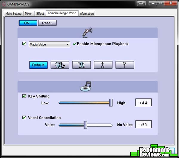 The only real benefit, or should I say feature, of the mixer tab’s options is the quick access option to enable monitoring of the microphone. By enabling the monitoring (the second button under the Microphone slider) you have the option to hear the sound effects found in the Karaoke/Magic Voice Tab (see below) as you speak into the microphone. I caught myself chuckling quite a bit while listening to the munchkin voice setting!