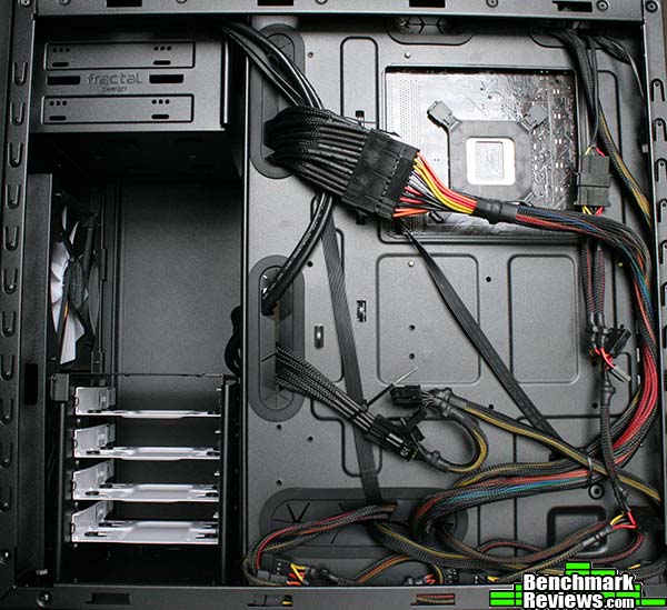 At the back we find 22 mm of space which really is more than enough to stuff cables at the bottom. Just to show how many cables you could stick in there we decided to use a non-modular power supply and we stuffed all the unused cables between the motherboard tray and the bottom of the case. You could probably do a better job than I did if you used a modular power supply.