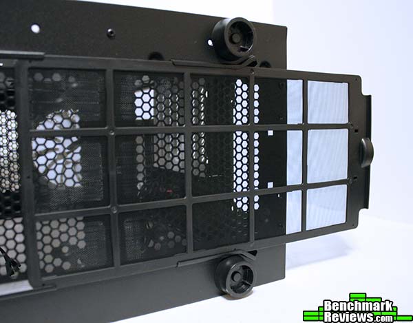 At the bottom we find the only dust filter in the case, however it should be noted that the front panel does have some dust proof foam that should protect the case from any dust unless you plan to use the top fans as intake. The dust filter is long enough to cover the power supply intake, and the fan that can be installed at the bottom.