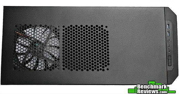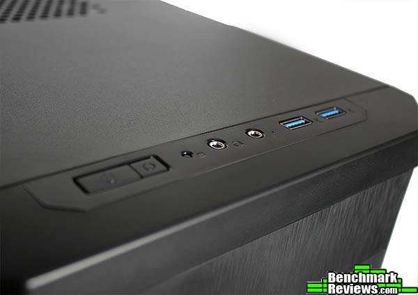 The Input / Output panel comes with 2 x USB 3.0 portts, a headphone and a microphone jack, a power switch, a reset switch and hard drive indicator light that along with the power button are illuminated by white LEDs.