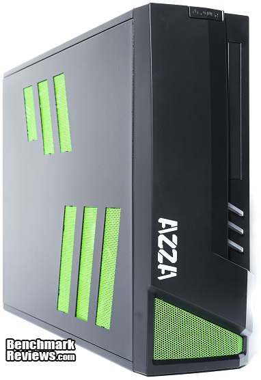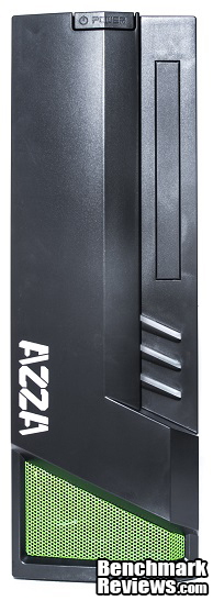 The front of the AZZA Z has an elegant and modern style. Although the front bezel is mainly made of plastic, it is still sturdy enough to withstand a few light knocks. Starting at the top is a power button. Coming down to the right is an optional bay for a slim DVD burner. Moving farther down are the three LED stripes and a green ventilation vent at the very bottom.