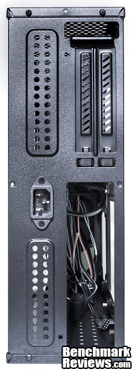 Taking a look at the back starting from the top, there are two expansion slots for a dual slot graphics card. Below the expansion slots is the back panel for the motherboard. To the left of that is the power plug. The power supply is actually mounted inside the case and can be hooked up to the power plug you see here.