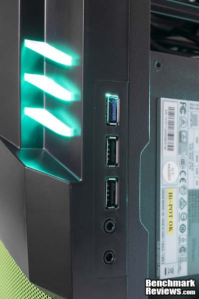 In terms of front panel I/O ports, we see the basic ports included with most computer cases. This includes one USB 3.0 port, two USB 2.0 ports, and a 3.5mm headphone and microphone jack. The power LED’s are made of three bright LED strips that glows green when the system powers on.