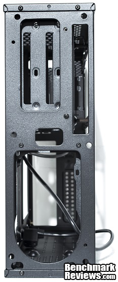 On the other side, we can have a better look at the cutouts for the motherboard, graphics card, hard drive cage, and power supply. I am very happy to see these large cutouts especially for the motherboard. This gives easy access to replacing the CPU cooler without the need to take out the entire motherboard. There are also no tie-down points for cable management. This is because when the side panel is on the case, there is no room for cables to run between the side panel and the motherboard tray. Cables must be routed within the case itself but they would not be noticed as the side panel has no windows.