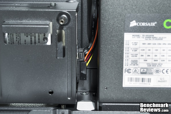 Here you can see why you must install the storage drives and replace the hard drive cage before anything else. As you can see, the power supply unit comes within under an inch of the hard drive cage. Connecting the SATA power and data wires to the storage device will be very difficult if the power supply is installed before the hard drive cage. It is recommended to use 90 degree cables to connect to your storage device(s) to prevent damage to the cables and the components around.