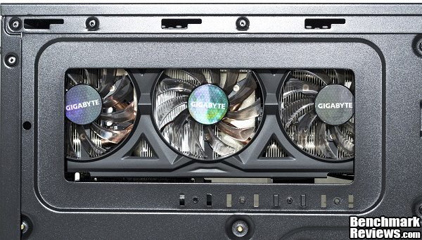 Looking at the other side of the case, we can see the cutout of the case that provides airflow to the graphics card. One thing that I did find out to be troublesome is the fan closest to the right will not spin as it comes into contact with the side of the case. There are removable rubber paddings on the other side of the motherboard tray to use as support to prevent the fans from coming into contact with the case and getting stuck.