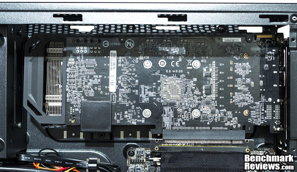 To see just how much space there is for a graphics card, I used a Gigabyte R9 270X Windforce edition graphics card to demonstrate just how much space is in the AZZA Z. Measuring at 11.5 inches or 292mm, the Gigabyte R9 270X exceeds the maximum graphics card length by 0.5 inches or 12.7mm. Amazingly, the AZZA Z just barely manages to fit this graphics card with just a couple millimeters of space to spare before hitting the hard drive cage.