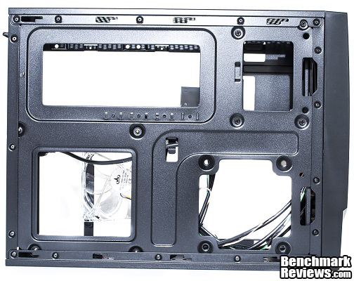 Taking off the side panel reveals the interior design of the AZZA Z. The interior is fairly well designed and should not be too difficult to work with for an experienced builder. Here we can see the 120mm fan along with several cutouts on the motherboard tray.
