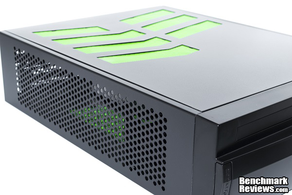 The AZZA Z is most pleasing to the eyes with its black aluminum body with green accents from the vents. The elegant curves and edges around the front bezel and vertical stand gives it a modern look and feel all around. Turning on the system reveals the bright green LED’s at the front panel and the bright LED’s from the 120mm case fan. I did find the LED’s to be a little too bright for my taste, but the option to remove and replace the preinstalled 120mm fan is available. The overall look will be most appealing to the younger generation because of the shiny lights and LED’s, but it would not be suitable for an office or professional environment.