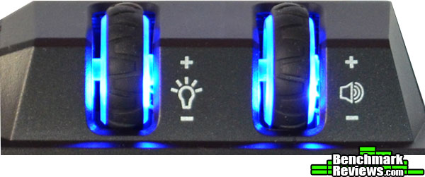 Above the left side of the main keyboard, are two wheels, once controls brightness (and the on/off function by press the wheel as a button) and one controls speaker volume (and a mute function by pressing the wheel as a button). These wheels are also illuminated for easier reference while in a dark room. I know what you’re thinking, since when do we game in the dark?!