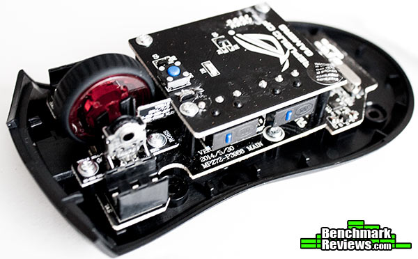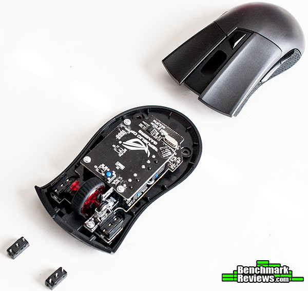 Probably one of the most innovative features I have seen in any mouse, is being able to open the mouse and swap the switches. This was clearly a first time for me. Fortunately ASUS has made this extremely easy, simply take off the four teflon feet, unscrew the four screws, and you will have access to the insides of the Gladius. In here we can notice that the two front, and two side switches are Omron.