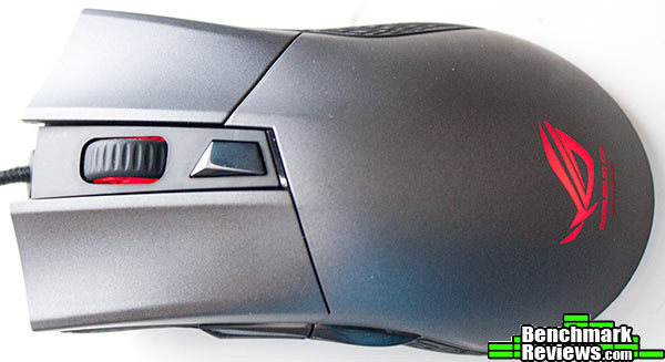 The scroll wheel has very segmented and noticeable steps, but it is not stiff and feels really well to turn. Under it is an ambient LED that gives the ASUS Gladius that Republic of Gamers look from the front. Behind the scroll wheel we find a DPI button that allows users to change between two DPI settings. By default it is configured in a low DPI setting which lights up the LED located right underneath the button. From the top you might also notice that the Gladius is not exactly meant for left hand users, as the right is curved inwards making it uncomfortable for left-handed users.