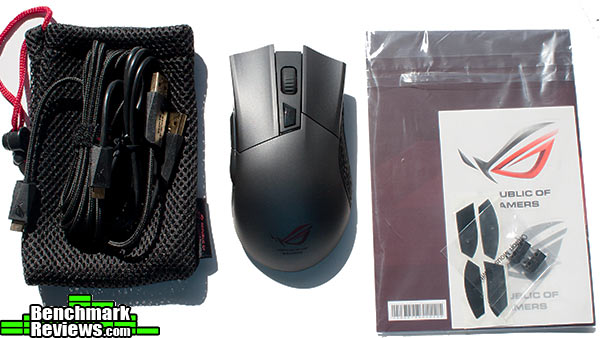 First let’s look at some of the accessories ASUS has included. Because the Gladius uses a detachable USB interface, ASUS has included two cable options, a 2 meter braided cable and a 1 meter rubber cable. These should give you the ability to use your mouse both at your home, or to easily detach it from your desktop and take it with you to school or work. Along with the carrying pouch that they also included ASUS has also included four Teflon feet, a user’s manual, some Republic of Gamer stickers, and two extra Omron switches.