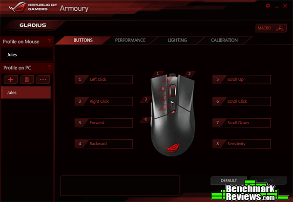 Every time you open the program, or what ASUS calls “The Armoury”, if there is a software or firmware update the program will install it. Once opened we find an overview of the mouse were you can select to customize anything from the scroll down to the scroll up, all the way to the sensitivity. To the left you also find which profile is being stored at the moment in the mouse.
