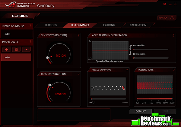 ASUS did really well to provide a dedicated performance area in which things like Acceleration and Angle snapping can be completely turned off. Of course, if you prefer to have some acceleration (as most people have become accustomed to) you can easily tweak all of this settings here. You can also modify polling rate, and the two programmable DPI settings.