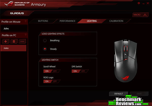 The lighting section is still lacking some customization. It does allow you to select which LEDs to turn on and off, but other than that you can only select between breathing and steady mode for the LED at the back. ASUS will most likely add more features later on. Remember that after each change to a profile you must save it, and then load the profile again into the mouse by dragging it to the “Profile on Mouse” Box.