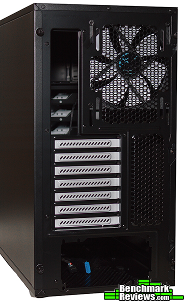 The back panel of the Define R5 has the standard assortment of expansions slots along with a mount for a single 120mm or 140mm fan. What it doesn’t have though, are grommets for external radiators. Of course, how many of us actually use external radiators, especially in a case that has plenty of room for internal radiators? Still, their lack is something of a departure from a usual feature in many traditional tower cases.