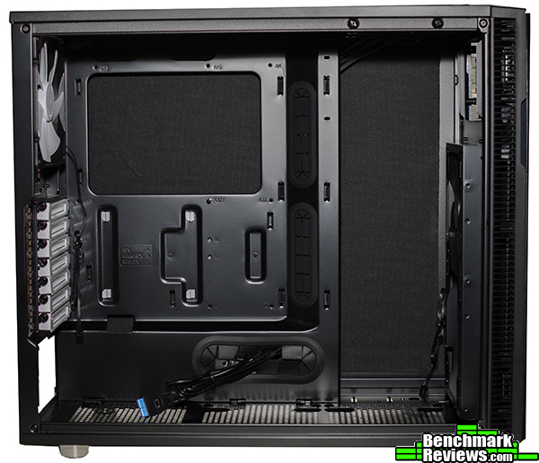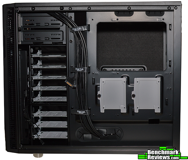 On the back panel we find a huge motherboard cutout more than 200mm across. Cable management is simple, with numerous tie down points, and more importantly, 31mm of space between the backplate and the outer frame. I say outer frame instead of side panel because with the panels in place you actually still get a few additional mm’s of space beyond the frame, even with the sound padding! Depending on where you route cables, you can get 20-35mm of space. It’s great to see Fractal Design take note of the problems some cases have combining sound dampening pads with cable management and come up with an excellent solution.