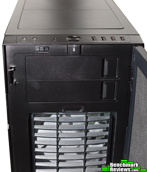 Opening the front panel reveals a pair of 5.25 inch drive bays, the full panel noise padding, and the dust filter in front of the dual 120mm/140mm intakes. The filter is removed by simple pulling down and out using the top flap.. Likewise, the 5.25″ bay covers are easily removed by pulling the latch on the side.