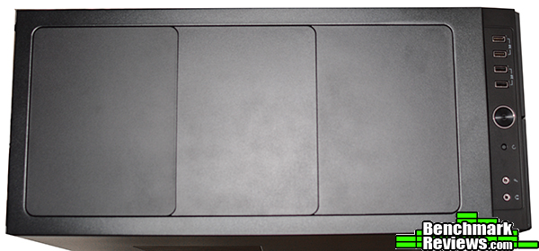 Another look at the front panel shows off the standard assortment of power switch, reset switch, and dual 3.0 and 2.0 USB ports. The power button is a push-button, and when I first pressed it down it got stuck. It seems okay now but be mindful that you push it straight down because it wiggles back and forth a bit. Also, right above the 5.25″ cages is a little three speed fan controller switch, which can control up to three fans.