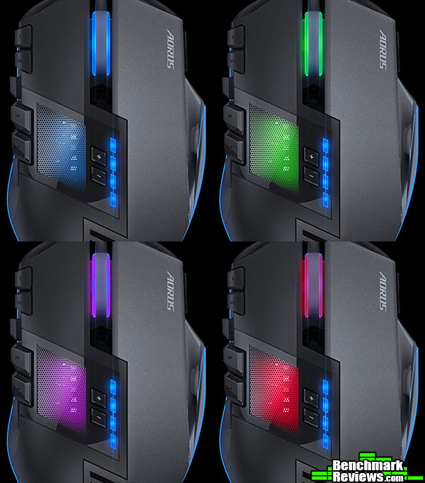 AORUS-Thunder-M7-Mouse-Profile-ColorsWhen selecting/cycling through the different profiles, the meshed window and the mouse wheel change colors. The headlights and the DPI level indicators stay blue.