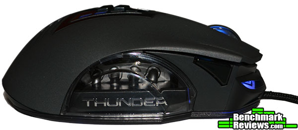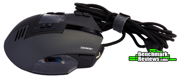 AORUS-Thunder-M7-right-side-viewNow keep in mind, this is a corded mouse, so you do have the slight hassle of having to route your cord within the clutter of cords behind your desk. However, the cord is a very nice brad with a gold plated USB connector that also includes a hook and loop cord keeper.