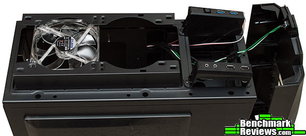 This photo shows the front without the plastic panel. The front fan mounts are covered by a removable dust filter, and you can also see one of the 80mm side fans in the left vent.