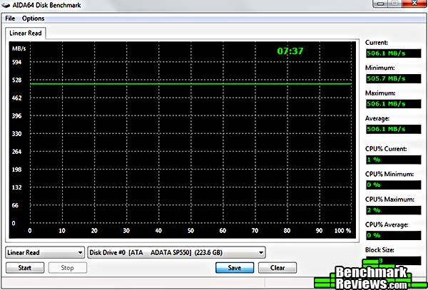 We run the AIDA64 linear read and write tests with a 1M block size. Charted above, read performance on the 240GB ADATA Premier SP550 SSD returned average speeds of 506.1MB/s.The SP550 has the smoothest, most consistent read performance on this benchmark that I’ve ever seen: note that the difference between the minimum and maximum recorded speeds is a mere 0.6MB/s. Most SSDs will have enough variance to make the line in the chart above visibly wavy.