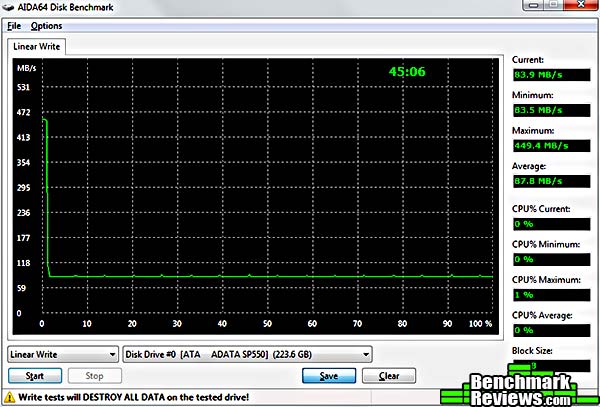 Linear disk benchmarks are superior bandwidth speed tools in my opinion, because they scan from the first physical sector to the last. A side affect of many linear write-performance test tools is that the data is erased as it writes to every sector on the drive. Normally this isn’t an issue, but it has been shown that partition table alignment will occasionally play a role in overall SSD performance (HDDs don’t suffer this problem).