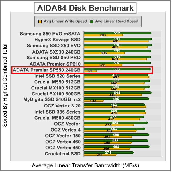 In our next section, we test linear read and write bandwidth performance and compare the speed of the ADATA SSD against several other top storage products using the AIDA64 Disk Benchmark.