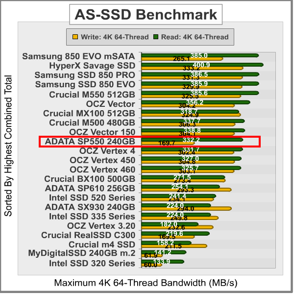 The chart below summarizes AS-SSD 64-thread 4KB IOPS performance results among a variety of enthusiast-level SSDs. The ADATA SP550 acquits itself pretty well in the read department– its score is only 13% below the top-performing Samsung 850 EVO– but its write performance in this part of the benchmark is the third worst. As you can see this is far below the single-threaded write performance and may show a weakness in the drive’s IOPS handling ability.