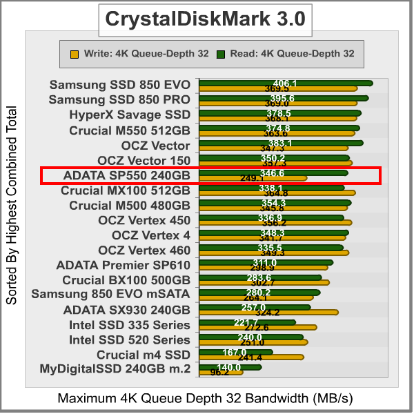 The chart below summarizes 4K random transfer speeds with a command queue depth of 32. The ADATA Premier SP550 does a bit better than mid-pack on reads, but falls rather far behind on writes with its 249.1MB/s score.
