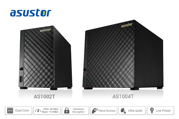 Taipei, Taiwan, September 21st, 2015 – ASUSTOR Inc., a leading innovator and provider of network storage solutions, has announced the launch of the brand-new AS1002T and AS1004T models, the first generation of ASUSTOR NAS products to make use of the ARM architecture. These 10 series models are powered by Marvell 1.0 GHz dual-core processors, 512MB of memory and hardware encryption engines, providing read and write performance of 95 MB/s and 110 MB/s. The exterior features a compact and stylish design, featuring an eye-catching diamond plate finish that allows the NAS to add a touch of modern flair to any space. The 10 series devices also feature low power consumption and ultra-quiet operation, producing only 19 decibels of noise during system standby, comparable to the almost inaudible sound of a pin drop. This allows it to seamlessly fit into any living space without disrupting the quality of life, making it the optimal personal cloud storage platform for the modern digital age.