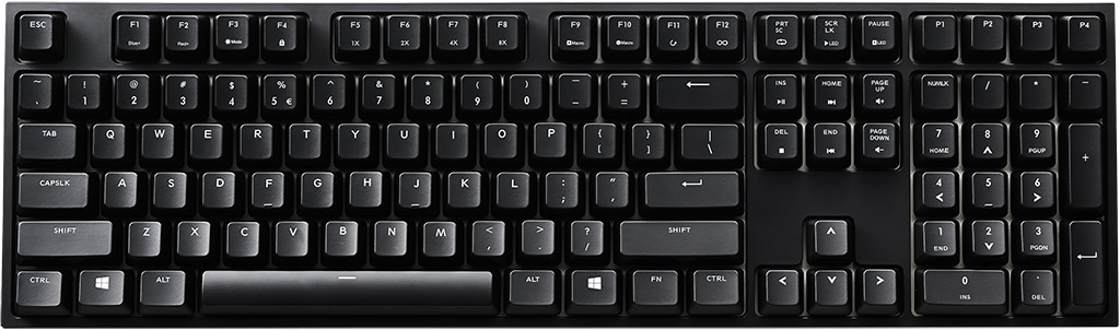 Measuring 17.28″ wide, Quick Fire XTi is a full-size (104 layout) keyboard with 108 total keys. Twelve function keys line the top of the keyboard, with a ten-key pad at the right and four programmable profile keys positioned above.