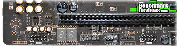 At the lower left edge of the board are the audio header, a two-digit POST code display, a trusted platform module connector (does anyone use these?), a system fan header, and the two front panel headers. After Windows has finished booting, the POST code display shows the CPU temperature, which is a nice touch.