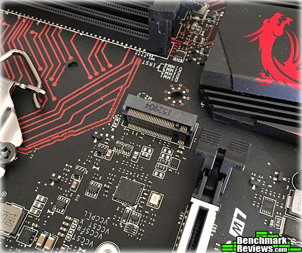 The MSI Z170A Gaming M7 motherboard follows the red-and-black color scheme MSI has used on their previous enthusiast boards. The layout is pretty standard for an ATX motherboard, with the only unusual items being the two m.2 slots (one occupied in this photo) under the first and fourth PCI-E X1 slots.