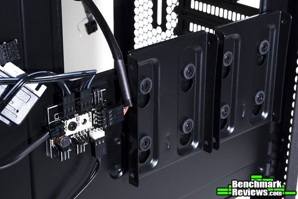 For cable management, three Velcro straps are included to tie down even the largest cables. The power supply chamber hides the cables coming from the power supply unit and includes two 3.5″ HDD caddies near the front of the case. Behind the motherboard tray are two more 2.5″ SSD mounts with both brackets included in the box. The bracket features a drop-N-lock mechanism for easy installation and removal. A fan hub is also included to control up to six fans and requires a single SATA power plug for power.