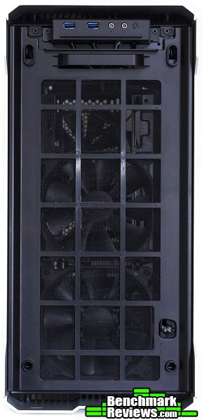 The front of the case is very simple with only the power LED near the bottom and a few air ventilation strips located towards the sides. Front panel I/O ports are hidden under a flap located at the top of the case. Because the Evolv ATX is targeted towards water cooling enthusiasts, 5.25″ ODD expansion bays are excluded from this case in order to make room for large interior components.