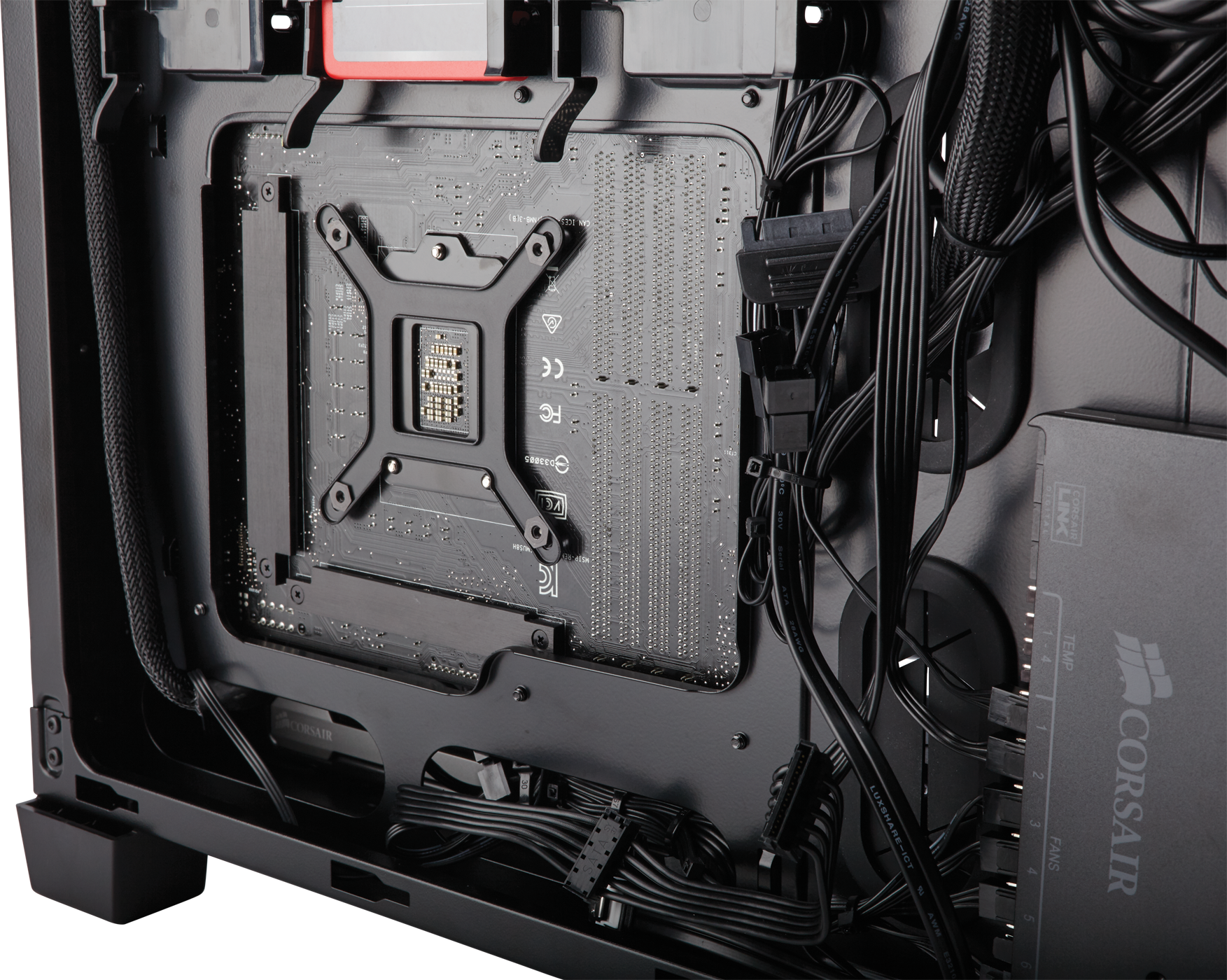A large cutout is available for mounting the motherboard backplate, 203mm across and 152mm tall. 25mm of cable space is provided along the entire side, making fitting any cables easy. Routing them however, might be different depending on how picky you are. Tie down points are only present along the outer edges and the edge of the cutout.