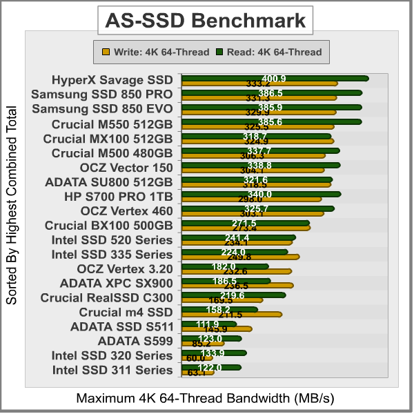 AS-SSD 64-thread 4KB IOPS performance results are displayed below, comparing several enthusiast-level storage products currently on the market. In the 64-thread 4KB IOPS performance tests, the 1TB HP SSD S700 PRO offering excellent performance, positioned among other the top SSDs of similar capacity. The chart below is sorted by total combined performance, which helps illustrate which products offer the best operational input/output under load: