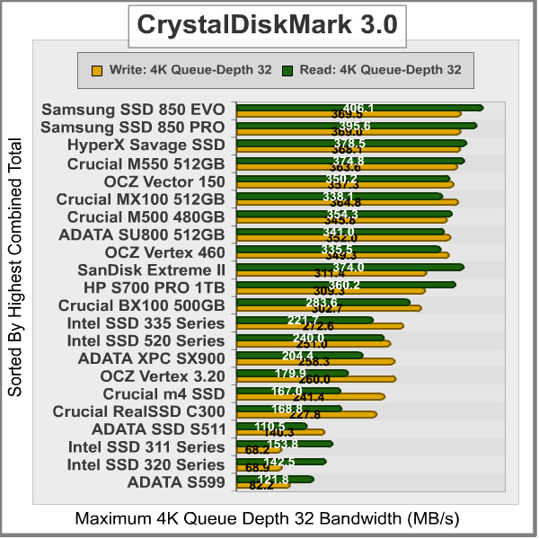 CrystalDiskMark 3.0 is a file transfer and operational bandwidth benchmark tool from Crystal Dew World that offers performance transfer speed results using sequential, 512KB random, and 4KB random samples. For our test results chart below, the 4KB 32-Queue Depth read and write performance was measured using a 1000MB space. CrystalDiskMark requires that an active partition be set on the drive being tested, and all drives are formatted with NTFS on the Intel P67 chipset configured to use AHCI-mode. Benchmark Reviews uses CrystalDiskMark to illustrate operational IOPS performance with multiple threads. In addition to our other tests, this benchmark allows us to determine operational bandwidth under heavy load.