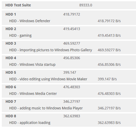 PCMark Vantage runs eight different storage benchmarks, each with a specific purpose. Once testing is complete, results are given a PCMark score while and detailed results indicate actual transaction speeds. The 1TB HP SSD S700 PRO produced a noteworthy total PCMark Vantage (secondary) HDD Test Suite score of 89333, positioning HP’s SSD S700 Pro at the top of our charts. Specific benchmark speeds reported below: