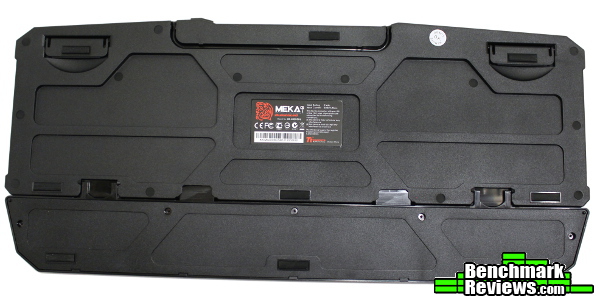 Flipping over the MEKA G-Unit Illuminated reveals a substantial number of rubber feet to prevent any sliding along with a channel for cable management. The Razer Black Widow Stealth keyboard I’ve been using for the past year struggles with this, and I’m glad to see Thermaltake include enough of these to keep this keyboard in place. The hard textured plastic used up top continues here, and the design on the bottom seems to help a little with flex. The Black Widow seems to be stiffer, and if Thermaltake uses a steel floor plate it must be pretty thin as I can still noticeably twist the keyboard longitudinally. Of course when the keyboard is sitting on a flat surface this isn’t much of an issue, and the only thing that really matters is flex while typing (which isn’t a problem whatsoever).