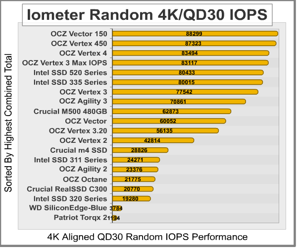 In our Iometer tests, which are configured to use 32 outstanding I/O’s per target and random 50/50 read/write distribution, SandForce SSDs generally outperform the competition when tested with this large queue depth. Previously, the OCZ Vertex 4 SSD delivered the best combined IOPS performance we’ve seen from any SATA-based SSD with 83,494. That was before the OCZ Vector 150 produced 88299 for a new all-time top score, or the Vertex 450 with 87323. OCZ’s Vertex 3 Max IOPS Edition produced 83117, followed by the Intel SSD 520 Series at 80,433 peak combined IOPS, then the Intel SSD 335 Series with 80015.